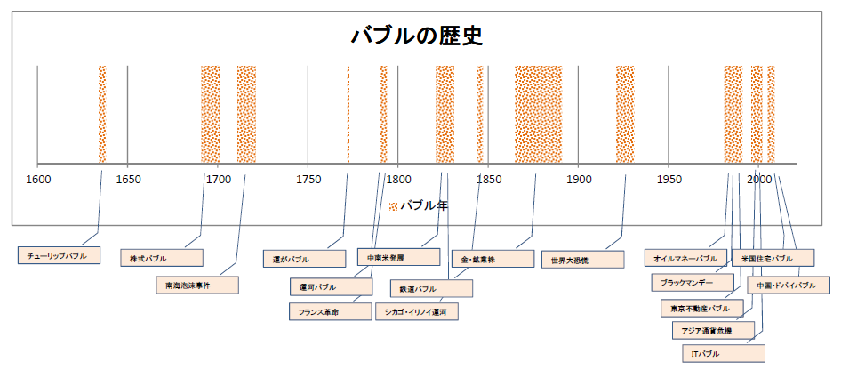 1600年台のオランダチューリップバブルから始まり、頻繁にバブルの崩壊が起こっているのが分かります。人間の欲望の足跡ですね。ここからはしっかりと学ばないといけません。