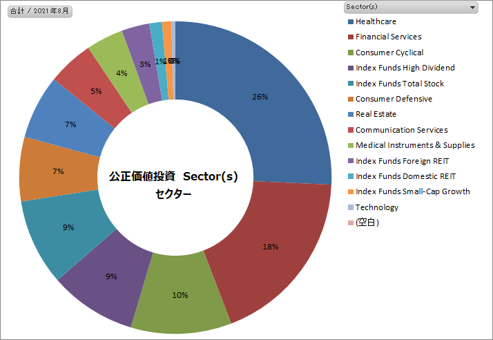 セクターと業種 2021年8月 –セクターはヘルスケア、業種は医療機器が引っ張っています。コロナの世の中なので、このような企業の価格が高いですね。^_^