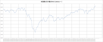 まずは、米国株式市場の割安性から。ここ10年ほどのS&P500のPERです。シラー先生のサイトに100年以上のデータが揃っていますので見える化しました。2005年からのデータをグラフ化しました。