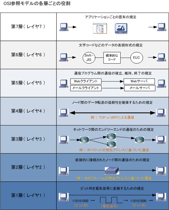通信の推奨モデルは上記のように、7つの層(レイヤ)に機能を分けて考えられています。