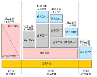 うちの会社は、第2号のところの一番右側になります。厚生年金の上に、確定給付型のDB(Defined Benefit)の企業年金が乗っている状態なので、その上にこのイデコが乗ることになりますね。掛金は14.4万円/年、1万2千円/月が上限となります。