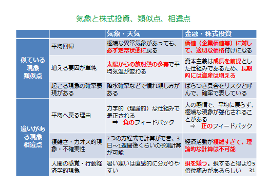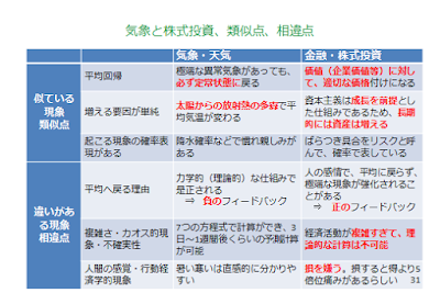 最後に、余談ですが、「気象」と「株式投資」の類似点、相違点をまとめておきました。