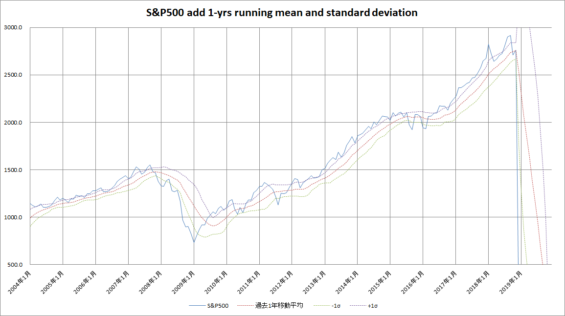 なお、今回のグラフ及び作成手法は、ブログ記事「定点観測 2017年7月 –過去1年移動平均と標準偏差からみた株式市場の買い場」に依っています。