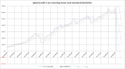 なお、今回のグラフ及び作成手法は、ブログ記事「定点観測 2017年7月 –過去1年移動平均と標準偏差からみた株式市場の買い場」に依っています。
