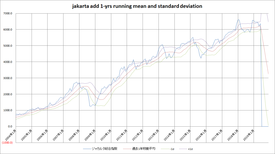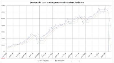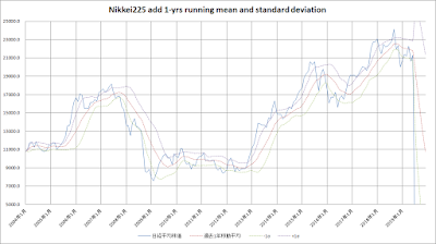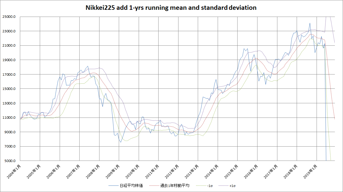 なお、今回のグラフ及び作成手法は、ブログ記事「定点観測 2017年7月 –過去1年移動平均と標準偏差からみた株式市場の買い場」に依っています。