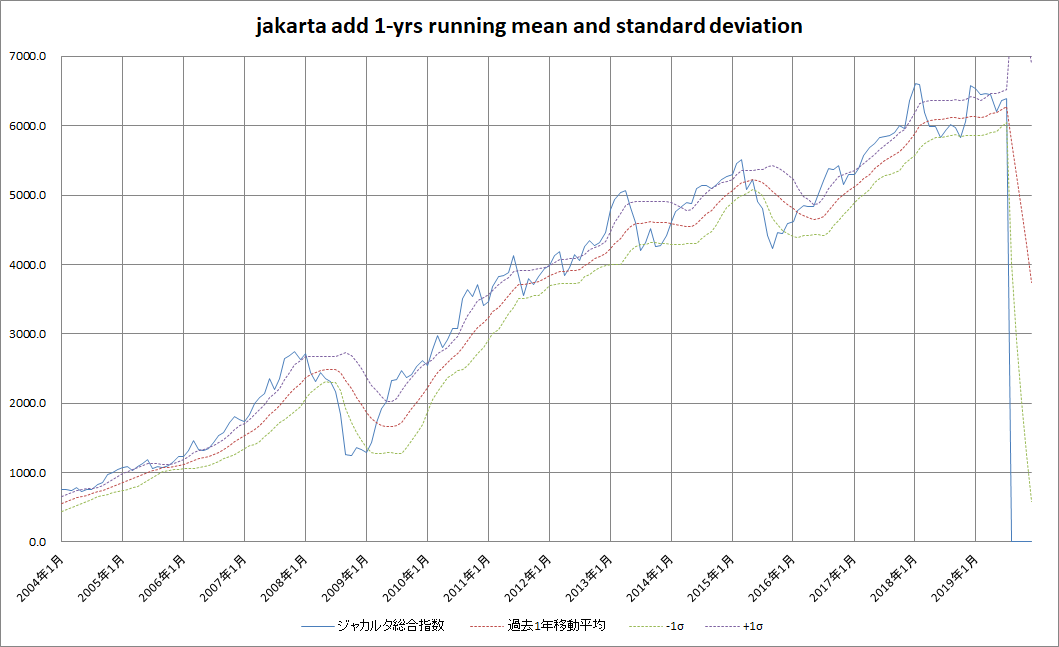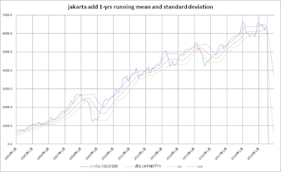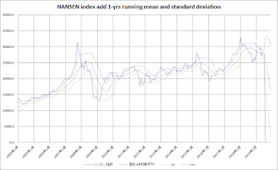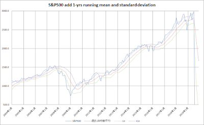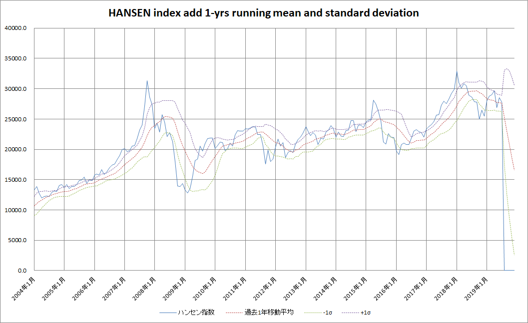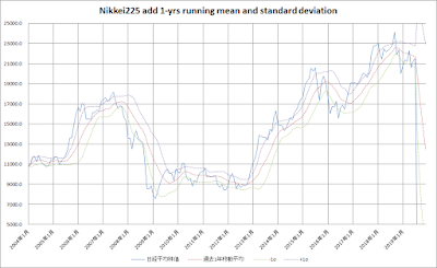 なお、今回のグラフ及び作成手法は、ブログ記事「定点観測 2017年7月 –過去1年移動平均と標準偏差からみた株式市場の買い場」に依っています。