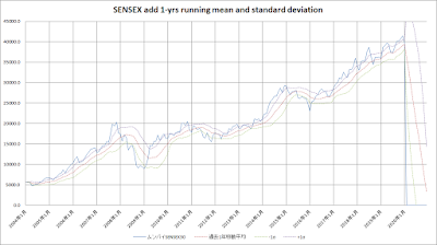 日経225は、1.91%下落。東京市場は下げ幅は少なめ。もっともっと下げてほしいですね。まだ、+1σを上回っていますので。