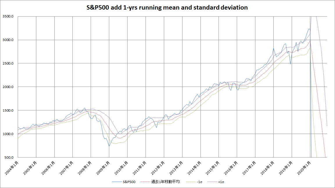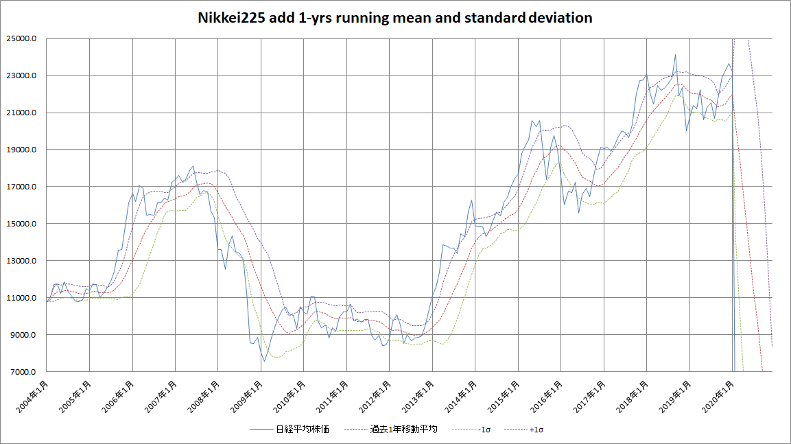 なお、今回のグラフ及び作成手法は、ブログ記事「定点観測 2017年7月 –過去1年移動平均と標準偏差からみた株式市場の買い場」に依っています。