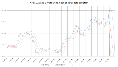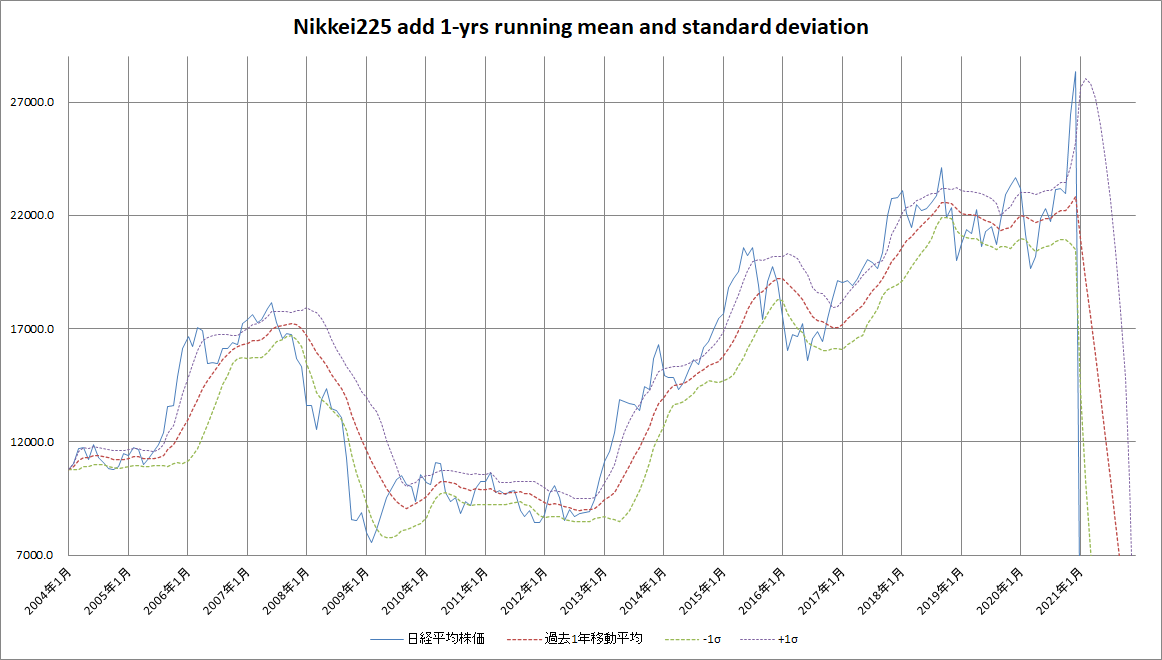 なお、今回のグラフ及び作成手法は、ブログ記事「定点観測 2017年7月 –過去1年移動平均と標準偏差からみた株式市場の買い場」に依っています。ワタクシゴトですが、2018年5月に本を出版しました。