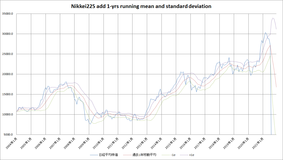 なお、今回のグラフ及び作成手法は、ブログ記事「定点観測 2017年7月 –過去1年移動平均と標準偏差からみた株式市場の買い場」に依っています。ワタクシゴトですが、2018年5月に本を出版しました。