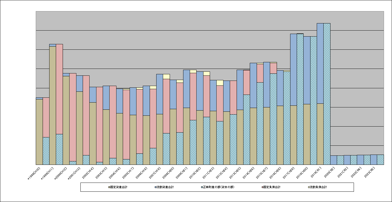 左側の青色の棒が流動資産、茶色の棒が固定資産。