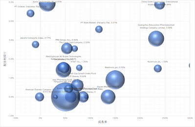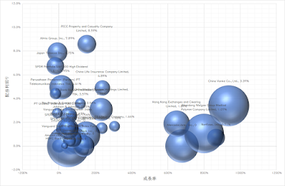 持ち株40銘柄くらいを、成長株の軸(横軸)、配当の軸(縦軸)で並べています。球の面積が時価総額になります。