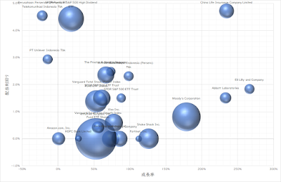 持ち株40銘柄くらいを、成長株の軸(横軸)、配当の軸(縦軸)で並べています。球の面積が時価総額になります。