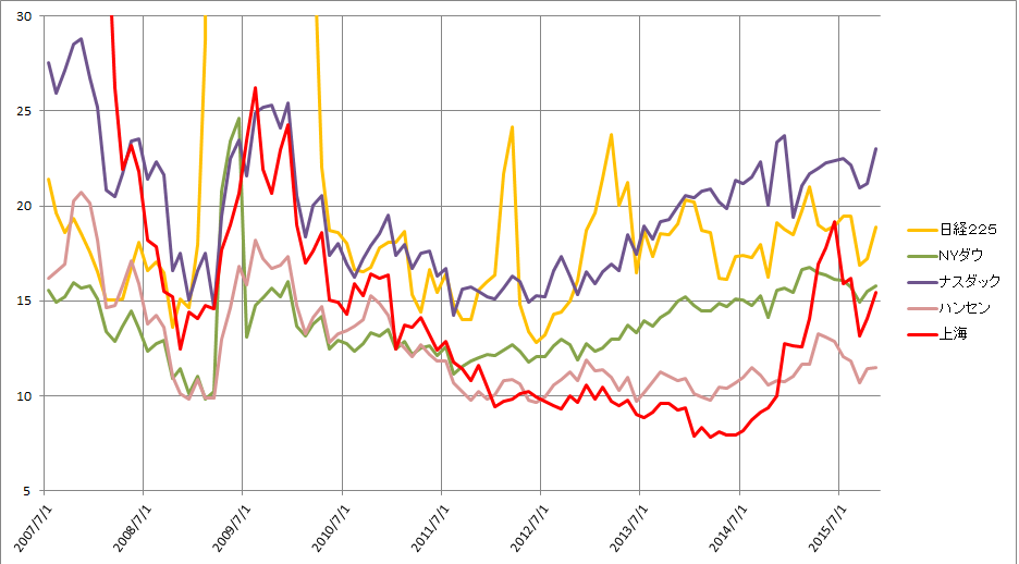 各国の株式市場のPERが載っているサイトがありましたので、そのデータを元にリーマンショック前からのPERをグラフにしてみました。