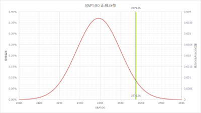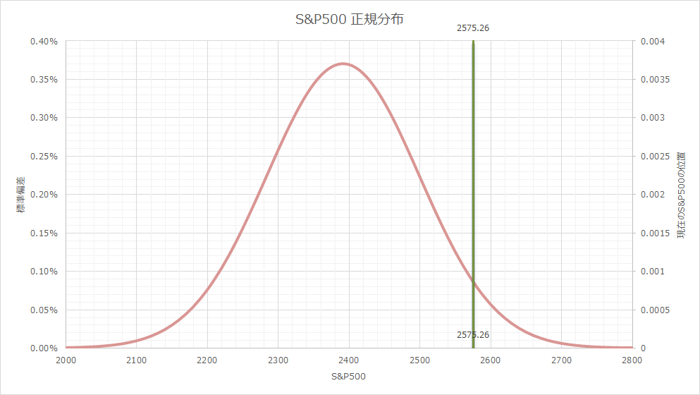 グラフを見て分かるように、現在の株価、S&P500のポイント、2575.26ポイントは、過去の確率分布に対して、かなり上皮にあります。標準偏差が、2499.18ポイントですので、それ(標準偏差、1σ)を遥かに上回った場所にあります。