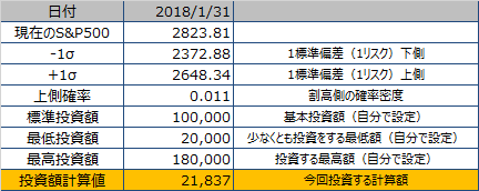 この確率で重みを付けて計算した今月の投資額は、標準投資額10万円、上限18万円、下限2万円の条件では、21,837円となりました。今までで最低の買い付け金額となりました。前月は25,582円。
