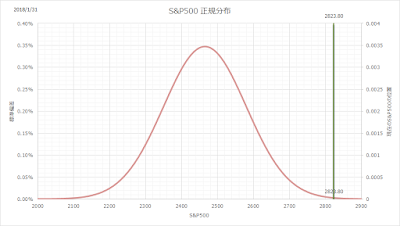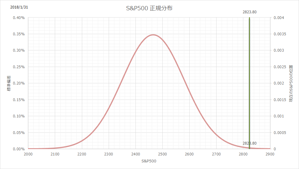 グラフを見て分かるように、S&P500のポイント、2823.81ポイントは、過去の確率分布に対して、かなり上側にあります。標準偏差が、2648.34ポイントですので、それ(標準偏差、1σ)を遥かに上回った場所にあります。