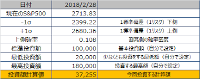 積立投資 2018年2月 –今月の積立額は37,255円でした。2月の暴落で少し標準偏差の上側に近づいてきました。まだ、平均投資額の10万円に比べれば少ないですね。(-_-)