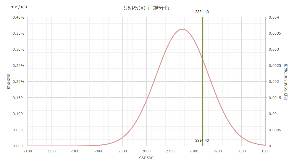 2019年3月の積立投資です。米国市場はさらなる上昇をしてしまいましたので、過去1年の正規分布に対して、現在の株価はかなり右に寄っています。高いですね。