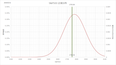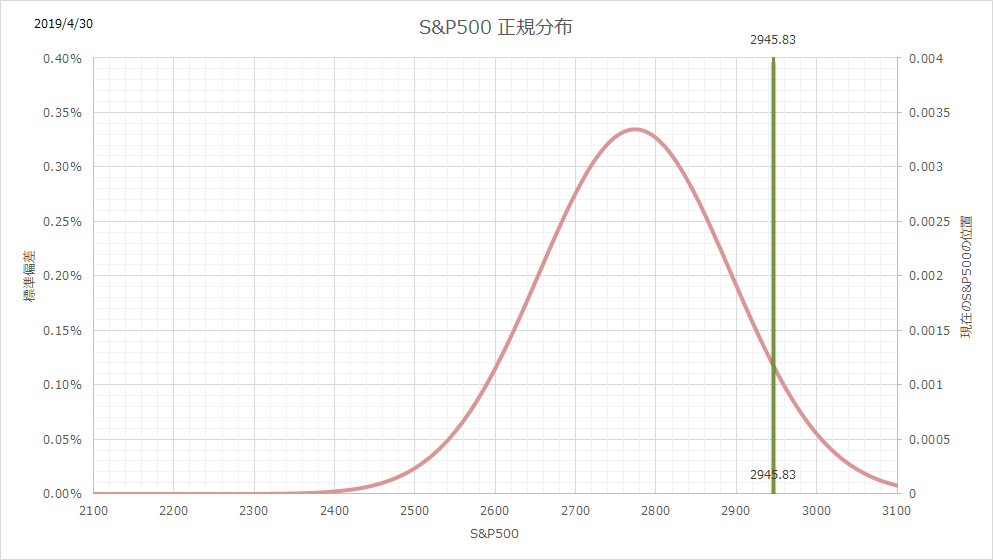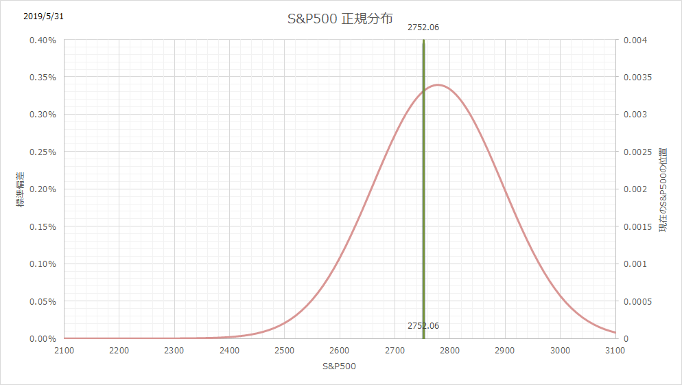 2019年5月の積立投資です。米国市場が上昇し、過去1年の平均で+1σ(上側の1標準偏差)まで来てしまっています。このため、現在の株価はかなり右に寄っています。