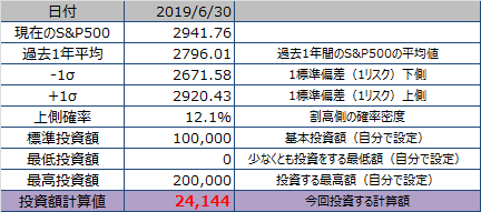 2019年6月の積立投資です。米国市場が上昇しました。上側確率が12.1%ということで、買い付け額はかなり少額となっています。39,316円。
