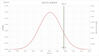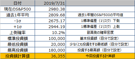 2019年7月の積立投資です。世界の市場が上昇しましたので、特に米国市場では買いづらい状況でした。上側確率が10.2%ということで、買い付け額は前月よりもさらに少額となりました。36,355円。
