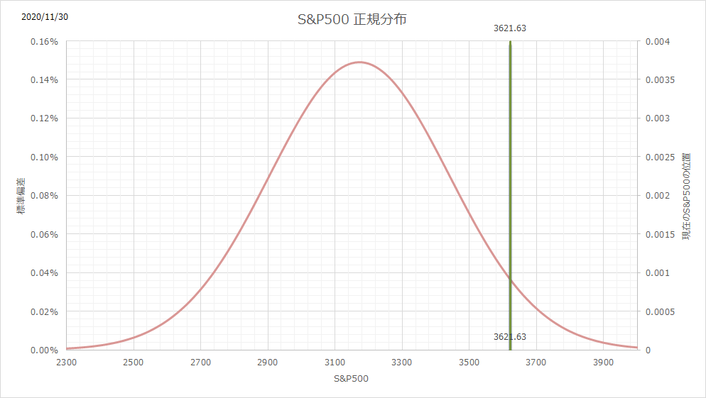 1年間の正規分布に対して、現在値の緑の縦棒は相当右側にあります。買いづらい状況ですね。