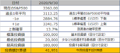 積立投資 2020年9月 –投資額は41,951円。前月まで続伸していた米国市場が少し下げましたので、計算上の投資額もやや増えました。もう少し待ちたいところ。(*^^*)