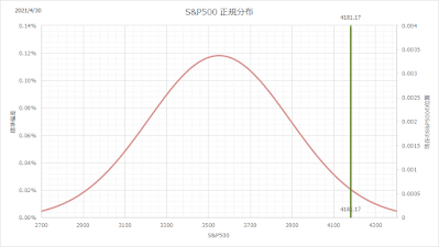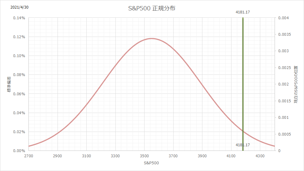 久々に米国株が調整局面になっているのですが、それでも過去1年のデータをベースにした分布から見ると、まだまだ現在値は高い方にあります。