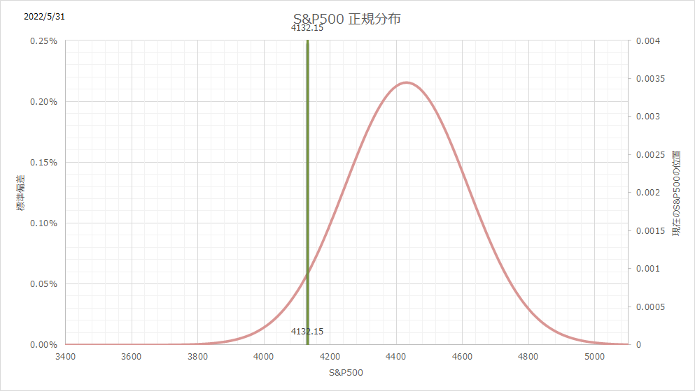 正規分布の確率密度関数のグラフを見ると、下の前月のグラフに比べて、山がなだらかになりました。これはばらつき(分散)が大きくなったということ。しかも現在のS&P500の値もかなり左に寄りました。下側確率は5%程度と、買付リスクがかなり小さくなっています。