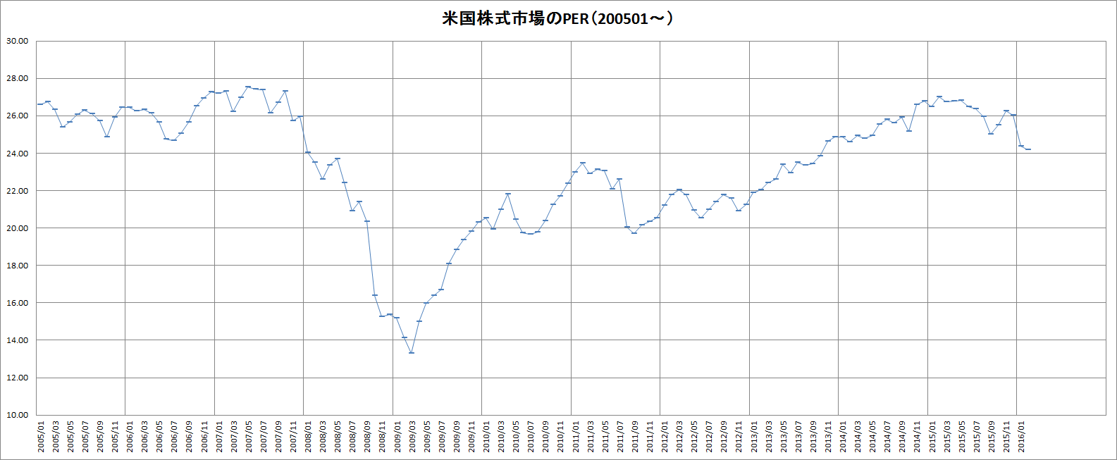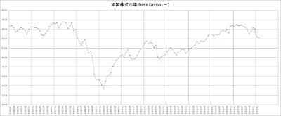 シラー先生のサイトからNY市場のPERが取れるので、ここ10年分をグラフです。