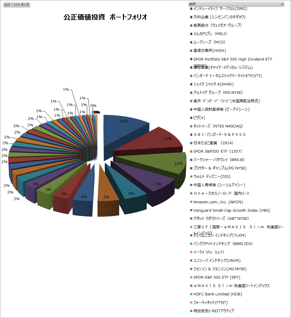 組入銘柄 2021年2月 –月末に各国市場が暴落しましたね。これからが楽しみです。ただ、それまで株高だったので、資産は最高額。^_^