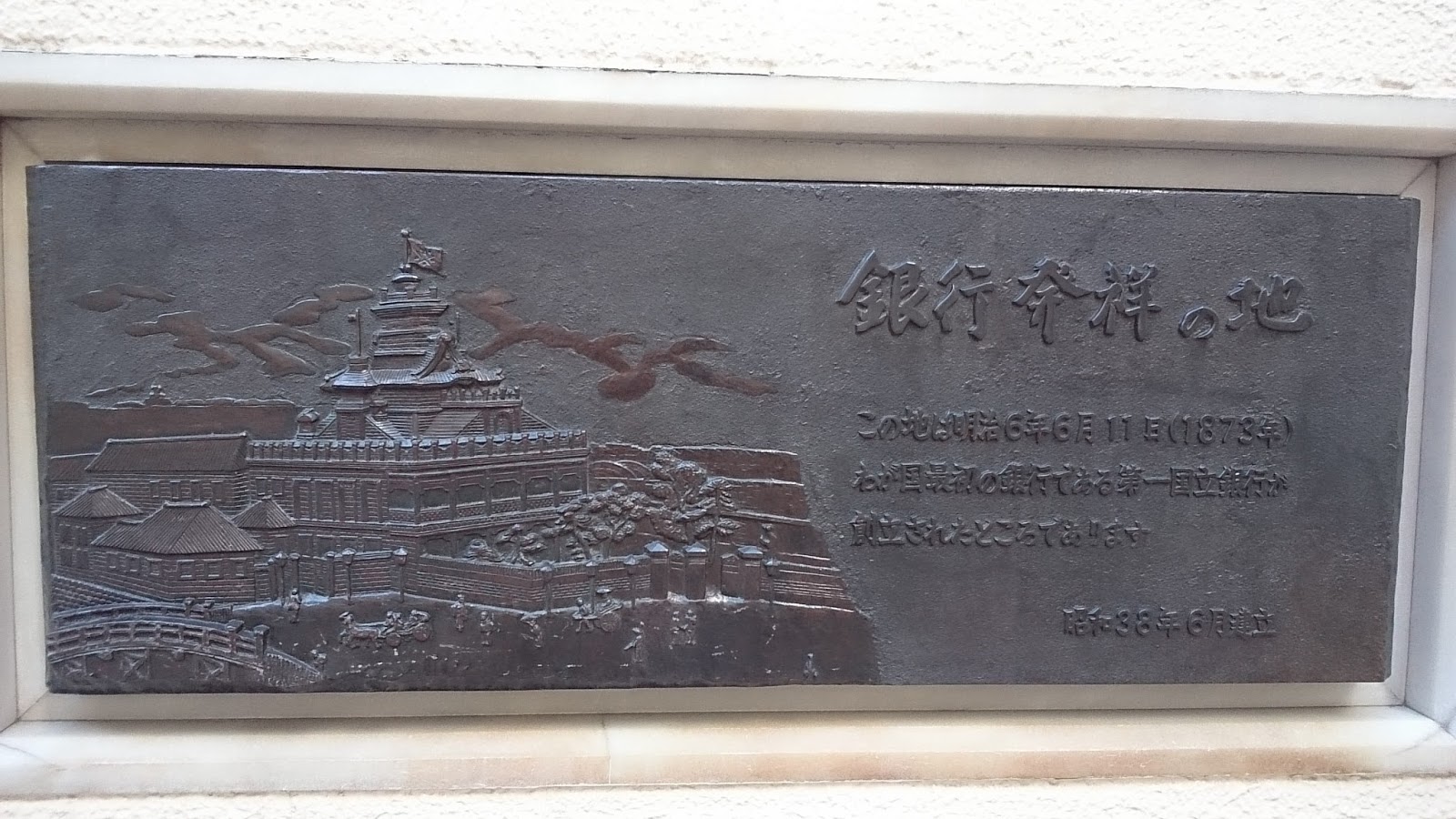 感動したのが、みずほ銀行の壁に、渋沢栄一さんの銀行発祥の地の碑が。