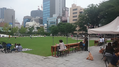 きれいに整備された芝生、子供が走り回っています。その周りでは、自由に過ごす老若男女。隣に都会っぽいカフェと言うか、ビールも飲める建物があって、大都会の憩いの場所となっています。