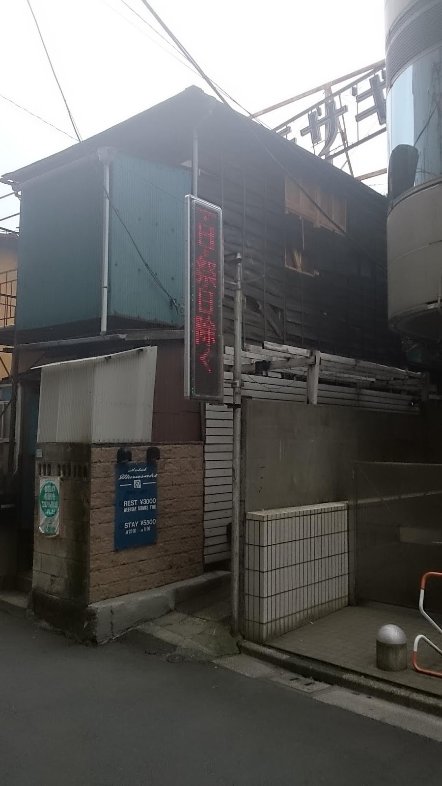 くぐってすぐに左の狭い路地を進みます。そこに怪しいホテルを発見。「ホテルむらさき」!!!!これは、ホテルなのか、ラブホなのか?入り口が怪しすぎるのですが、奥の上にはムラサキの看板のようなものが・・・・。なにでしょう?
