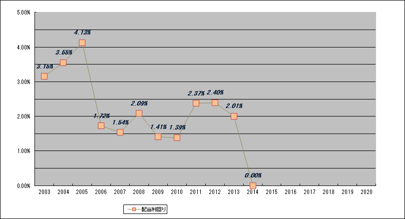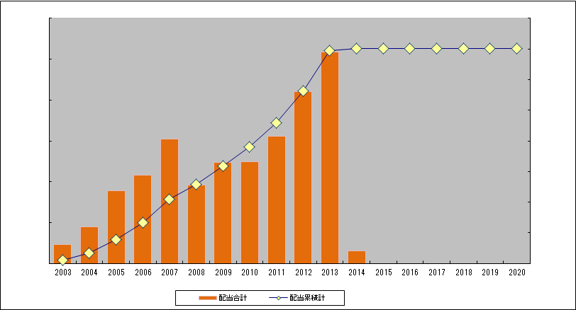 今のところ順調に伸びているグラフとなっています。2003年からの2013年までの11年間での単純な配当額の伸びは年率22%くらいの複利利率。また、リーマン・ショックで一度下げた2008年からの配当の伸び率(同じく複利)は18.05%となっています。