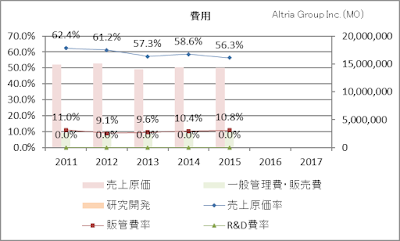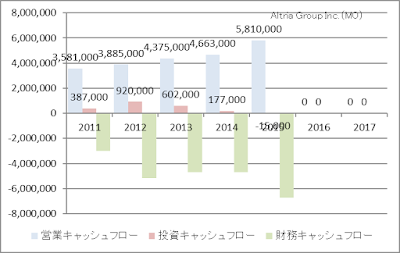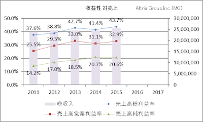 では、今回の主題であるアルトリア・グループの業績を追ってみましょう。アルトリア・グループはマルボロ銘柄のブランドを有するタバコ製造・販売会社です。この会社は、高配当でも有名で、現時点の予想配当利回りは3.28%となっています。私が購入した2年ほど前は、配当利回りが5%を超えていましたので、少し割高になっていますね。