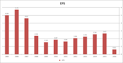 まずはEPS、一株利益から。2008年に大きくEPSを下げていますが、これはこの都市に、海外への販売部門として、フィリップ・モリス・インターナショナルを分離、スピン・オフをしたためです。2009年の更なるEPSの落ち込みは、リーマンショックです。