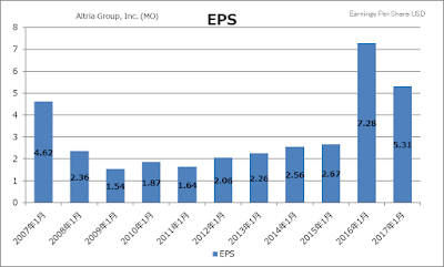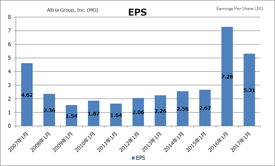 2016期に跳ね上がっていますが、これはアルトリア・グループが保有している会社が企業買収をしたためで、一時的な要因です。