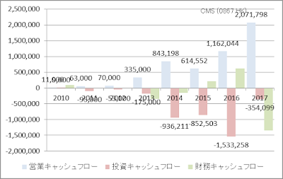 本業が成長していますので、本業を表している営業キャッシュの玉の大きさがどんどん大きくなっているのが分かると思います。なお、2017期は財務キャッシュフローが大きくマイナスとしていますので、財務体質の改善をしていると思われます。