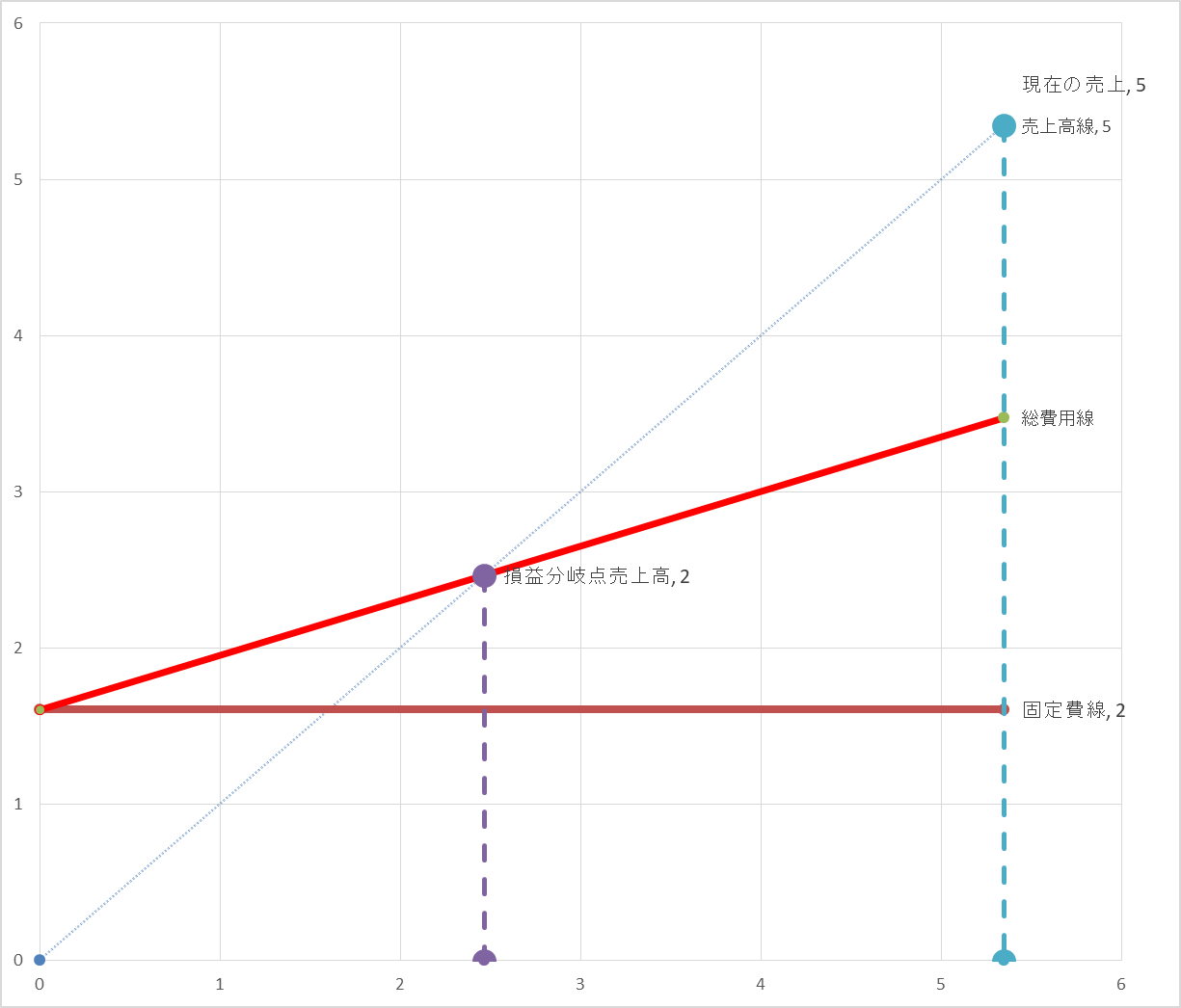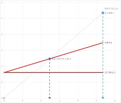 まずは、最新の2017期の損益分岐点の図になります。固定費はやや高いところにありますが、赤い線の傾きが緩いです。つまり変動費率がそうとう低いです。