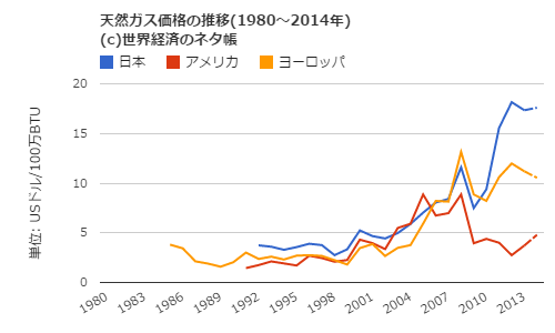 天然ガス価格の推移(1980~2014年) 出典:世界のネタ帳 |