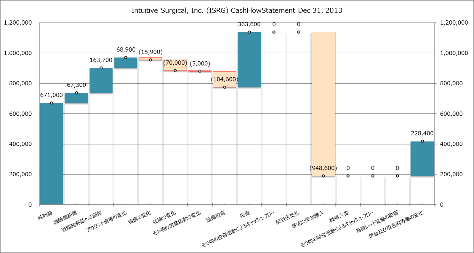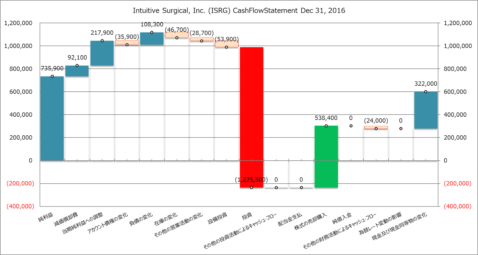 Intuitive Surgical, Inc. (ISRG) 銘柄紹介 –米国の手術機器・手術ロボットの大手。遠隔手術、低侵襲外科手術では圧倒的なシェアを保持し成長中。今回はキャッシュフローをウォーターフォールチャートで見てみます