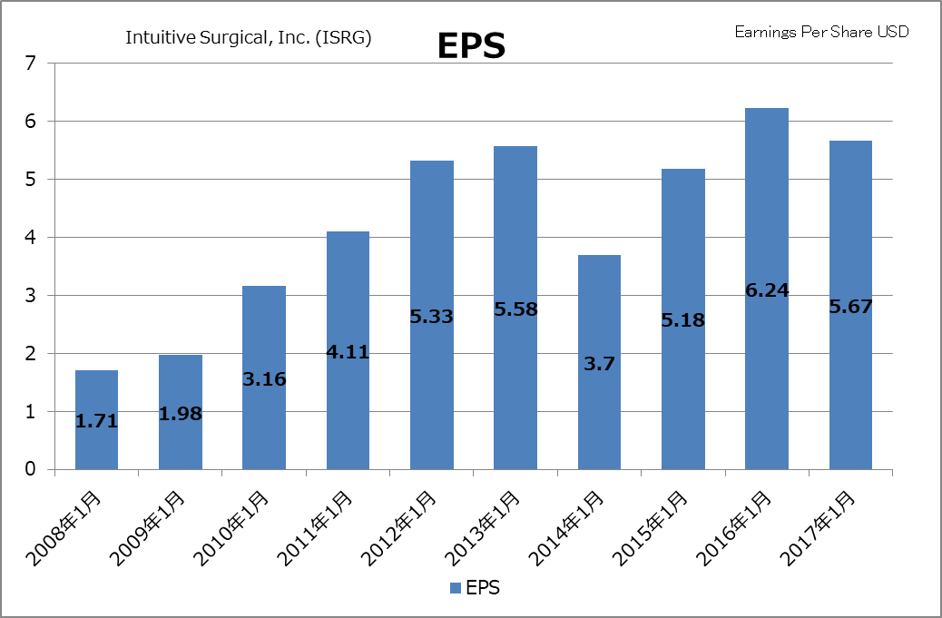 Intuitive Surgical, Inc. (ISRG) 銘柄紹介4 –ロボット手術の米国最大手。成長事業を踏まえて、2017期決算の収益性を見てみます。今回は一時的にEPSを下げているようです。