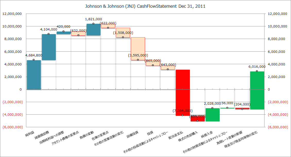下記のグラフ↓は、キャッシュフローの滝チャートです。