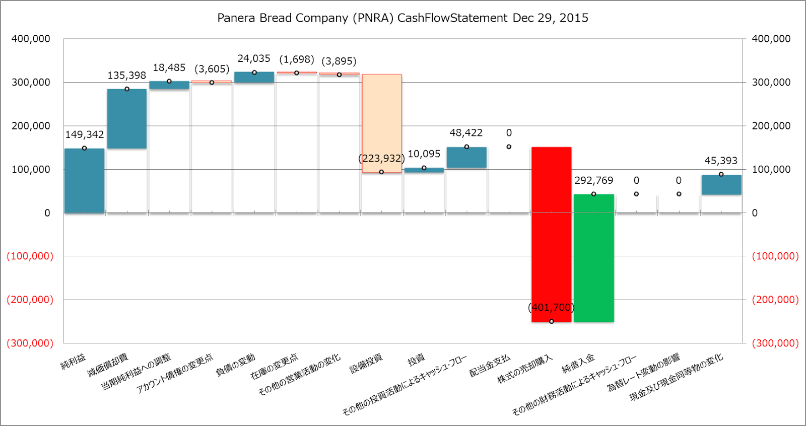 株式購入と純借入金ですが、ホームページの財務諸表、Statements of Cash Flowsを見ると、株式の購入は自社株買い、純借入金は長期借入金のようです。パネラブレッドは2013年まで無借金でしたが、2014年度から借入をしています。
