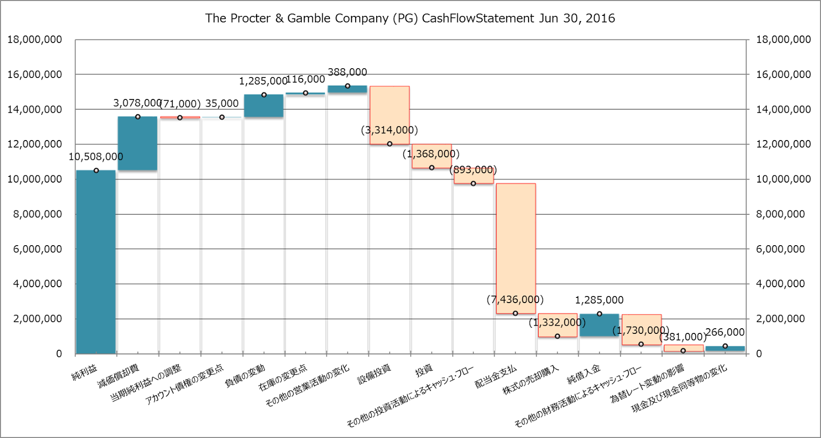 2012年から2016年までの5期に渡るキャッシュフローをウォーターフォールチャートにしてみました。安定した形となっています。