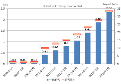 売上の増加に伴い通常の企業はDPS(一株配当)も上がってきますが、 ユナイテッドヘルスグループは配当性向も10%以下から30%まで引き上げています。これにより、EPSの伸び以上にDPSが成長しています。とても株主思いの会社だと思います。