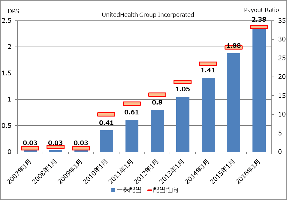 売上の増加に伴い通常の企業はDPS(一株配当)も上がってきますが、 ユナイテッドヘルスグループは配当性向も10%以下から30%まで引き上げています。これにより、EPSの伸び以上にDPSが成長しています。とても株主思いの会社だと思います。