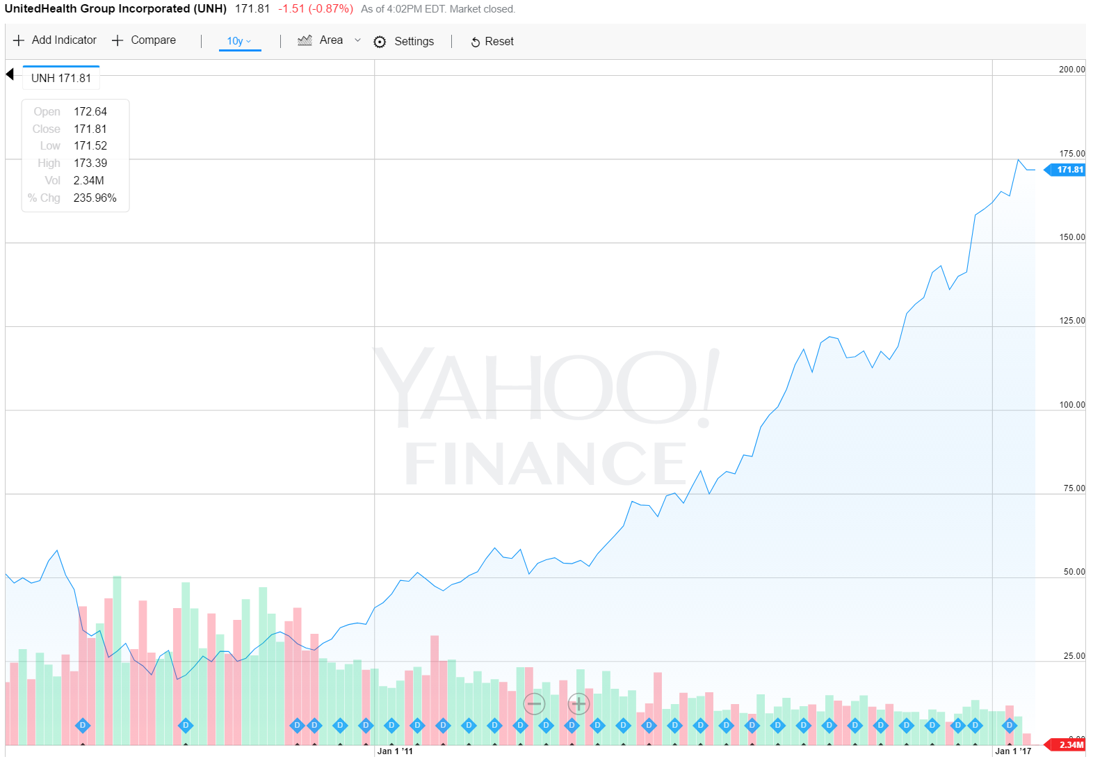 ユナイテッドヘルスグループの株価10年チャートです。50ドルから175ドルと約3倍になっています。